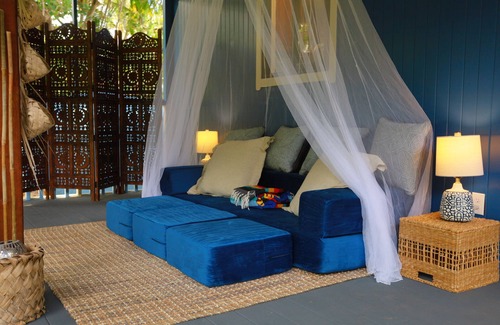 - one queen convertible sofa outside on the back lanai, with a bug net canopy. Not official bedding, but available for the adventurous as "glamping".