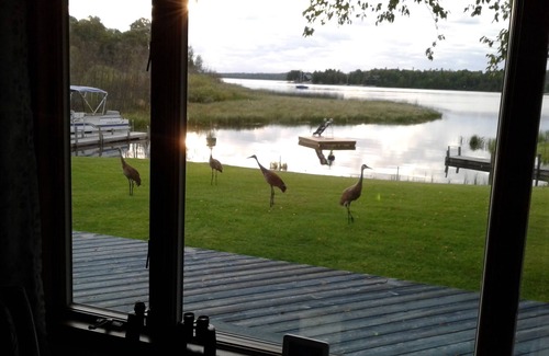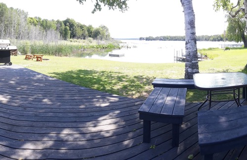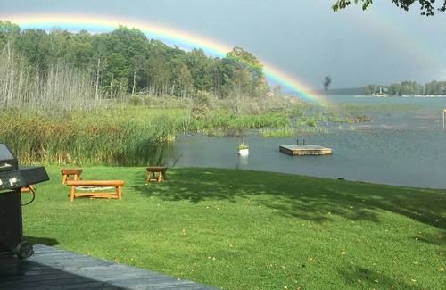 Outside is a front deck with grill, table, and chairs. Out front is a dock providing a boat slip for you, while the other is for the caretaker’s boat. Often there is a swim raft in the bay. In the front yard, is a fire pit with log style seating and enough firewood provided for a campfire. There is a lot of wildlife in this area. Often two families of ducks are being raised in the cove, with plenty of deer, sandhill cranes, and other wildlife in the lake or passing thru. The bay itself is about 6 ft deep and the bottom is not rocky or sandy, but muck(a squishy soft bottom). On the front right side of the yard, is a rarely used right of access to the water for some family members. On the satellite view, you will see outside the kitchen window is a private drive, which gets occasional use by people not knowing it is a private drive.