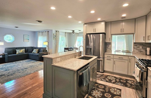 The home which features a open concept so unwind in the perfect living room with remote control gas fire place, smart TV, sectional couch that can turn also into a full bed for the unexpected guest, diningroom with seating for 9,