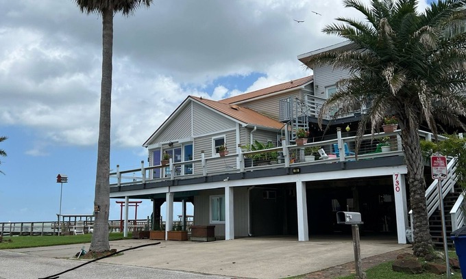 This beautiful vacation rental home overlooks Galveston Bay in Kemah, Texas. It is one of only two homes available for rentals that is located within 3 minutes walking distance of the wildly popular Kemah Boardwalk entertainment complex. The home will easily sleep 16 people and features a recent remodeling of the bathrooms and kitchen. The primary home has 4 bedrooms and 4 bathrooms and a detached guest room with bath resides on the ground floor. Therefore there are 5 total Bedrooms and 5 bathrooms. There is a 220 foot private pier available for those who wish to go crabbing or fishing or both. Five crab traps are located on the pier and there is an elevated observation deck at the end of the pier with a 360 degree view. One of the unique aspects of this home is the 2600 square foot wrap-around wooden deck - complete with outdoor bar. The deck also attaches to the ocean side balconies and the balconies are connected with a spiral staircase. This is a gorgeous home with spectacular views. Great for fishing, relaxing or entertaining.