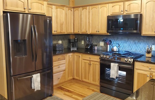 The lower level is a complete living area with 9' ceilings. The family room is furnished with a 42' flat screen satellite HDTV, DVD player, surround sound system and two pull out sofas: one queen-size and one full-size. There is a dining room and another complete kitchen with a dishwasher. There is a 2nd laundry room with washer and dryer. There are two bedrooms on the lower level with a king-size bed in one bedroom and two twin beds in the other bedroom. There is a full bathroom with a tile walk-in shower with multiple heads. The lower level offers 1800 square feet of living area with over 1000 square feet of covered porch overlooking Portage Lake. Radiaint in-floor heating in the lower level will keep you cozy all year round. The lower level will sleep 8 guests.