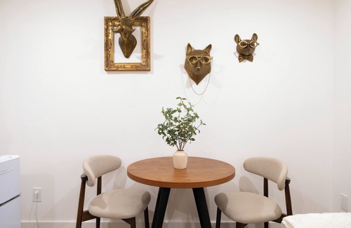 perfect for enjoying a quiet moment or a meal outdoors. As night falls, gather around the brand-new fire pit in the shared outdoor area, a cozy spot perfect for relaxation under the stars. The suite features a modern, fully-tiled bathroom with quartz countertops, providing you with a luxurious touch of privacy. The kitchenette is fully equipped for your needs, featuring a small fridge, small toaster oven, and beautiful quartz countertops. A portable stove is also available for cooking, and we offer complimentary coffee and tea for a delicious breakfast. For your entertainment, the 55-inch TV comes with access to Netflix and Disney+, ensuring you're set for relaxing evenings indoors. Need a little extra space for your little one? A portable crib is available upon request. Games & toys are provided! While there is another shortterm rental above, rest assured, our soundproof doors ensure your privacy and comfort during your stay.