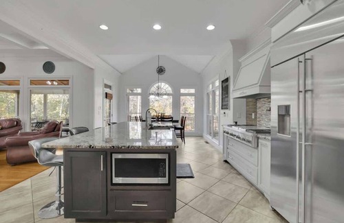 Step outside to enjoy two large, screened decks with a spa, putting green, and fire pit. The outdoor kitchen includes a built-in grill and Green Egg for al fresco dining. Relax under the stars or take a refreshing dip in the heated pool.