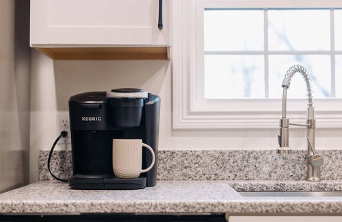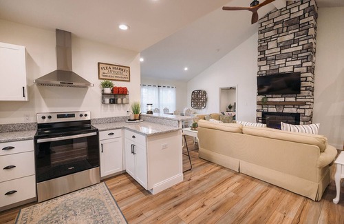 As you step through the front door, you'll be greeted by an open-concept living area. The first bedroom, located to the right, features a king-size bed and sleeps two guests. The second bedroom, just past the first, offers a queen-size bed and also sleeps two guests, with both rooms having their own attached bathrooms. A dining area and fully equipped kitchen complete the interior. Step outside to enjoy your morning coffee on the back patio, where you can listen to the birds chirp. Guests are welcome to park in the two-car garage. The other side of the duplex is rented to a long-term tenant, but both units have separate driveways and private spaces.