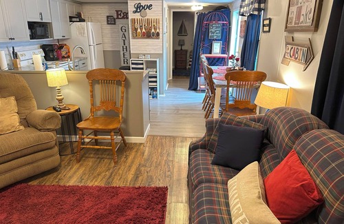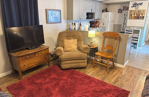 Escape to Kentucky Lake - Jonathan Creek, FAMILY FRIENDLY Cabin style 2-bedroom mobile home in Benton, Ky. Unwind in the small but cozy 770 square foot cabin with 2 Queen bedrooms and a pullout sofa in the living room, for a total sleep capacity of 6. Equipped with WiFi, washer and dryer, heating, and AC, outdoor camping firepit, woods, walking trails and much more. These cabins are just a small part of our six acres and are just a few yards from our private dock on Ky Lake. Your comfort is guaranteed! Refresh after a long day on the lake with the full bath/shower combo bathroom. A phenomenal retreat for guests seeking a peaceful getaway or just wanting to immerse themselves in a true Kentucky lakeside cabin-camping style experience. Our heated and cooled camping style cabins are nestled approximately 7 minutes in either direction from the popular Belews (burgers and ice cream) in Aurora or the famous Fast Eddies restaurant - (with grocery, Bait and Tackle) towards Draffenville, KY. There are several other restaurants within 8 minutes, including Mexican food and BBQ! We are centrally located only 15-20 miles from Murray, KY and Benton/Draffenville. There are a couple of big beautiful bald eagles that fly over and nest right next door and usually roost in our front yard trees once or twice a day! There are also groups of deer that stroll through the property randomly! PLEASE NOTE: All rental sites share accommodations, such as porches, fire-pit, chairs and private dock area. Please bring your own supplies, chairs etc. much like camping in the event that other renters are sharing the same spaces! There is plenty of room on the property to spread out if you want a more private outside setting! One boat OR jet-ski may share a dock space at the private dock during your stay and the driver of the boat MUST BE SOBER as there are always small children at play. Only guests 25 and older may book this property. No Bachelor/Bachelorette parties are allowed. This is a family friendly property, with potential neighbors close by, so we ask you respect the noise level after 11PM. We also have a three bedroom, two bath AND campsites available for rent if you have a large family and want to all gather at once. Owners live close to the water on this same property if you need anything, just ask! We allow golfcarts or ATVs to travel back and forth to the lake while renting (aprox. 600 yard walk to the dock slightly uphill see pictures!) For extended family, consider adding our 3 bedroom adjoining cabin, visit our vrbo site https://www.vrbo.com/4556584?dateless=true VRBO # 4556584
