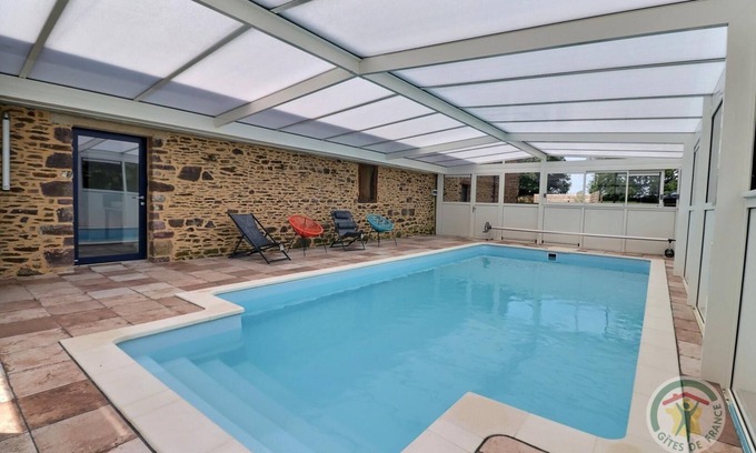 On the ground floor : a dining room with a kitchen (SENSEO coffee maker), a large living room of 92 m² (small reception area) with direct access to the private swimming pool heated to 29° and covered under a veranda (size: 9m 1.60 m) and open all year round with sanitary area (two sinks, a cabin with a shower and a toilet, a separate toilet), A bedroom with a 160X200 bed and its private bathroom, A laundry area and a separate toilet. First floor : A bedroom with a 160X200 bed that can be converted into two 90X200 beds, its private bathroom and its separate private WC, A bedroom with a 160X200 bed and two 90X200 bunk beds, its private bathroom and its separate private WC. On the second floor : A bedroom with four 90X200 beds, A bedroom with a 160X200 bed, a bathroom and a separate toilet. Parking in private car park. 17 km from Paimpont, this 15th century manor listed as a Brittany heritage site welcomes you in a green setting on a large wooded property. Adjoining the owners, the gîte, completely renovated in 2022, offers spacious, well-appointed spaces, offering beautiful rooms with complete private bathrooms. The authenticity of the local stone architecture with exposed beams and beautiful volumes, combined with current decoration in soft tones, gives a refined atmosphere to this house of character having preserved its most beautiful period assets (monumental fireplaces, turret stairs). A change of scenery and relaxation will be on the agenda for your stay to be shared in a small group of family or friends. 7.5 km away, the Domaine de Tremelin will await you for sporting and leisure activities: swimming and water activities on its lake (kayak, canoe, pedal boat), mini-golf, equestrian center and tree climbing.