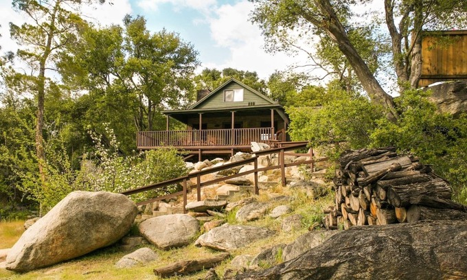 Perched high on granite boulders with incredible western views of the rugged Greenhorn Mountains, you'll feel right at home in your California getaway. A lovely seasonal stream sometimes runs through the property during spring runoff (California weather dependent, please inquire). You can hear the Kern River from the cabin then walk the sandy path to your own slice of riverfront. Relax in the boulder patio or swing in the hammock & take in the serene landscape. On the covered deck, unwind with yoga or a book with coffee in the morning. Watch the sunset over the majestic peaks with a cocktail in the evening. Enjoy a BBQ on the patio under the oaks. When it's chilly outside, unwind with a board game in front of the cozy wood fireplace. The night sky gives way to stargazing and the calming sounds and scents of the southern Sierras.