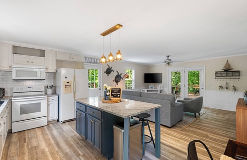 Kerr Lake Escape sits on the waterfront, with a private dock just a short walk away—ideal for launching paddle boards, heading out on the kayak, or just relaxing on the floating mats. Outdoors, guests of all ages will enjoy the basketball hoop, cornhole boards, and plenty of space for adventure and relaxation.