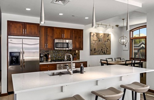 Walking into Kestrel Corner, you are greeted with a large entryway with a walk in closet, a bench and cubbies to store your gear. The primary bedroom is to your left as you start to walk towards the main living area and includes ample closet space, and one of those original art pieces you can view while slumbering in the new king bed! The ensuite bathroom is spacious with double sinks, a large walk in shower and soaker tub. Head down the hall to enter the kitchen, living and dining space of the property, showering you with an abundance of natural light. Meal prep at the island means you are never left out of the conversation. Seating for 6 at the dining room table allows the entire group to dine together and play cards or games while looking out at the views of the ski area. Two couches frame the living room giving everyone a chance to spread out while watching a movie or cozying up to the fireplace. The second bedroom includes a new queen size bed, large walk in closet and the 2nd bathroom is just outside this bedroom. The washer and dryer are located in a closet in this second bathroom along with extra storage space to tuck anything you want out of sight. A sleeper sofa in the living room round out the sleeping options at Kestrel Corner.