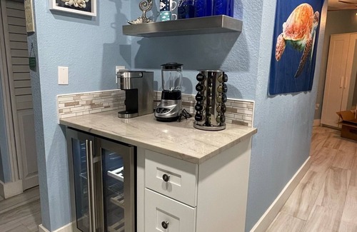 The kitchen is fully equipped to elevate your culinary experience, providing essential tools such as pots, pans, and kitchen utensils. Additionally, the unit boasts two coffee makers (regular and Keurig), a kettle, plug-in tea kettle, 4-slice toaster, blender, food processor, electric can opener, and more. To keep your beverages at the perfect temperatures, a separate wine and drink fridge is available in the kitchen. A full spice rack and a basic selection of coffees and teas are provided for your convenience.