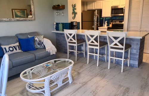 Our 1 BR, 1 Bath coastal-inspired condo has it all. Lets start with the living room queen sleeper sofa with gel memory foam mattress. Or, enjoy the new KING bed (rare in 1 bedroom units). Other upgrades include the gorgeous white quartz counter tops, new ceramic tile floors and island decor. Back by popular demand- the onsite poolside Island Grill bar is NOW OPEN!