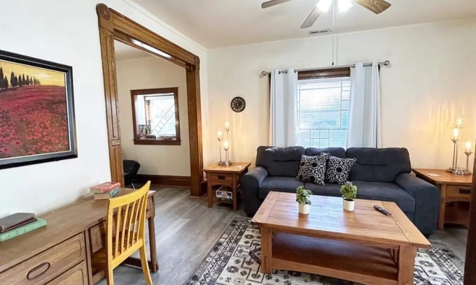 Enjoy a stylish experience at this centrally-located place. Located in the center of Topeka, this private old-charm 1BR w/king bed and den- located adjacent to the Stormont Vail Hospital , downtown, and a short drive to trendy NOTO. Close to the Kansas Capitol and I-70. Follow the paths of the FreeState Movement and the fed desegregation of schools at the Brown v. Bd of Ed National Historic Site. PETS WELCOME! Sleeping for 2 people in bedroom and 1 extra on fold down couch.
