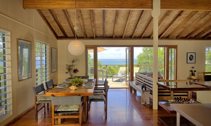 Kgari's totally private treetop setting has extraordinary 180 degree views from Orchid Beach to Sandy Cape. This house was one of the first built in the area and remains the gem of Orchid Beach. Kgari is carefully designed and tastefully furnished for comfortable open plan holiday living. The exceptionally well appointed kitchen is always well received by those who enjoy cooking. Kgari is Ideal for families or two couples.
