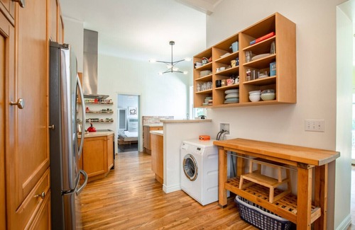 The wide-open kitchen area has ample space for you and yours to enjoy cooking some wonderful meals and holiday cookies. The kitchen is fully stocked with a wide selection of spices and cooking utensils, pots, pans, and more. The laundry is located just off the main kitchen area and is a washing machine, with clothing drying racks available.