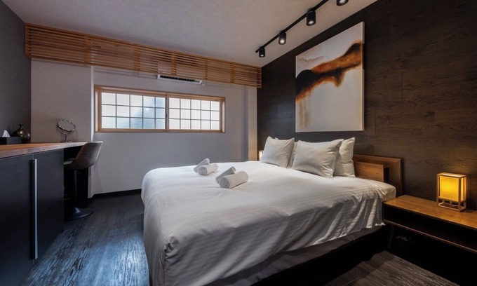 Kikyo is a modern and stylish retreat that perfectly balances contemporary design with warmth and comfort. Located just southwest of Imadegawa, this beautifully designed home features dark wood paneling, natural wood accents, and plush furnishings that create a welcoming atmosphere for up to four guests. Whether you’re lounging on the leather sofa in the living room, preparing a meal in the fully equipped kitchen, or working in the quiet bedroom workspace, Kikyo is thoughtfully designed for relaxation and convenience. Its prime location near Kyoto's Imperial Palace and Nijo Castle makes it an ideal base for exploring the city’s rich history and culture.