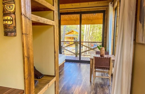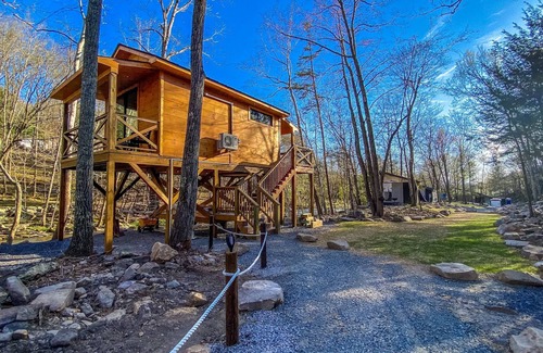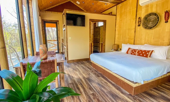 Four Fillies Lodge is an 84 acre private estate available for you to explore & enjoy. Our Kilimanjaro Safari Treehouse is a top of the line romantic cabin with modern amenities and huge windows for optimal views of the creek. Includes 1 King bed, 1 full bathroom, and a kitchenette. This is the perfect place to enjoy relaxation or adventurous activities such as fishing, hiking, caving, white water rafting, and so much more! (additional rentals are available at FFL through VRBO)