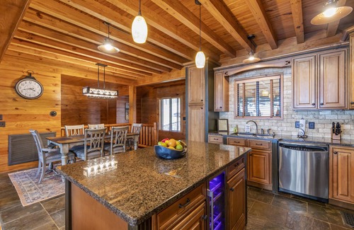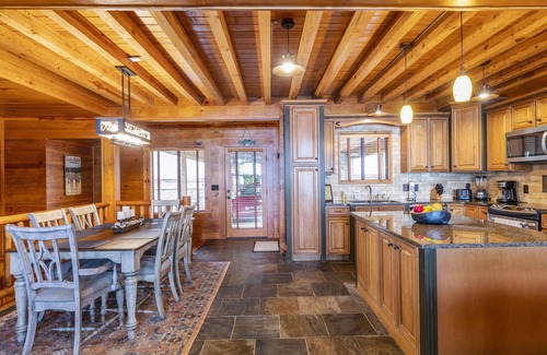 The lower level boasts a large rustic family room/rec area with a 75 inch tv for watching movies or sporting events, and a table that seats 4 which is also great for games and puzzles. There are 3 additional bedrooms on this level. Two of these very large bedrooms have beautiful views of the lake. One has a queen bed and the other contains an adjustable king bed. The 3rd bedroom has 2 full beds and a large tv. A full bath with a tub/shower combo and a laundry room with finish out this level. Double french doors lead out to the beautiful lower patio with a seating area and table for 6. It is a short walk with a gentle slope down to the lake and dock.