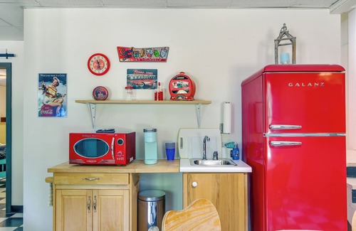 KITCHENETTE: Fridge, microwave, hot plate, toaster oven, griddle, Keurig, electric tea kettle, dishware & flatware