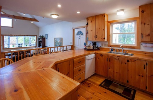 When you walk into the home from the road side of the lot, you will first walk into a large "mud room" where you will have a clean and secure space to hang your hat/coat and store any ski gear, bikes or other recreational toys you decide to bring up. You will then enter the home near the kitchen where you will be greeted with an open floor plan, vaulted ceilings, real pine everything, a fully equipped kitchen, and floor to ceiling windows. The "breakfast nook" serves as a sunny place to dine in the morning and a beautiful family gathering space in the evening. There are two equal sized bedrooms with one queen bed in each room that share a common bath. We have two couches (not fold out) and can provide bedding for an extra fee. It is heated by gas and always warm and cozy (to your liking of course). When you walk through to the back of the home (away from the road), you are greeted with beautiful vaulted ceilings and floor to ceiling windows that overlook farmland, horses and the green mountains you came here for!