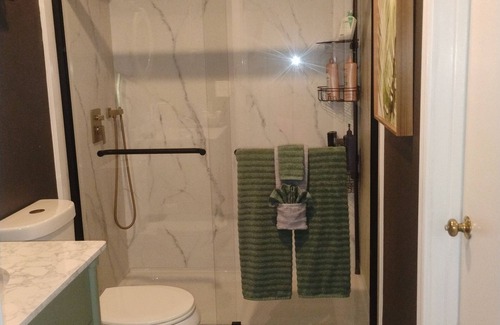 Second Queen Bedroom: Includes a flat-screen TV and direct access to the hot tub. The bathroom across the hall offers a full-size shower with glass doors.
