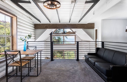 Rounding the stunning iron and wood staircase you will discover a full bathroom with walk-in shower and cool rustic features, including a barrel sink, and Bedroom #2. This cozy corner bedroom with its comfy queen bed and lots of natural light is something special. It has a private entrance which leads to the back porch where you are bound to see a special tenant of the cabin, a Great Horned Owl.