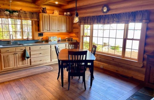 The guest cabin, equally comfortable, includes two bedrooms, a full bathroom, a cozy living room, and a dining area, offering a more intimate atmosphere. Both cabins are thoughtfully designed with rustic-chic interiors, creating a relaxing and memorable lakeside experience. Step outside to enjoy the expansive grounds with an outdoor dining area, perfect for al fresco meals with stunning lake views. Gather around the outdoor fire pit for evening stories and s'mores under the stars. Your private dock provides direct access to the water, ideal for swimming, fishing, and launching your watercraft. A heated garage is also available for storing your outdoor gear and vehicles, ensuring convenience and comfort throughout your stay.