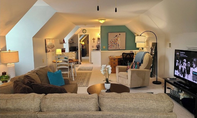 *Breakfast items in suite and local treats included**. Large 900 SF apartment above our garage. It is set up with a separate entry, one bedroom with new king size bed, full bath, private water closet, living area offers sectional sofa-sleeps 1 and 2 twin beds ( One is a Select Number), queen size air mattress (please arrange in advance), 54" TV, luxury kitchenette (Refrigerator, microwave/air fryer, 2 burner induction cooktop, sink, coffee pot, French coffee press and blender.) Dining table, 2 desk and desk chair.