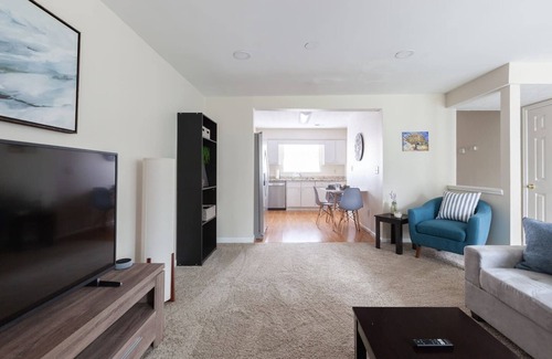 Beautifully decorated and newly renovated with new appliances, this space includes a large living area with an L-couch, big screen TV, full kitchen, King and Queen beds with private bath and memory foam, desk, and washer&dryer. Self-check-in with secure electronic locks for easy access.