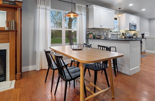 The living room opens into the dining room which boasts a large picture window that overlooks Main Community Park and has seating for four people. The spacious, updated kitchen has sleek, stainless-steel appliances and an open-concept. There is a large granite countertop and tons of cookware, plates, silverware, spices and glasses so you can enjoy a home-cooked feast.