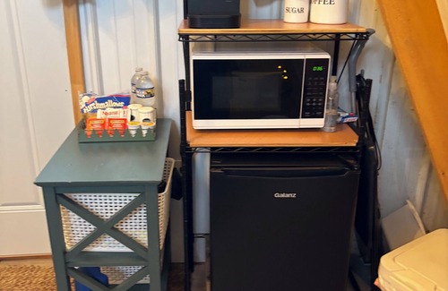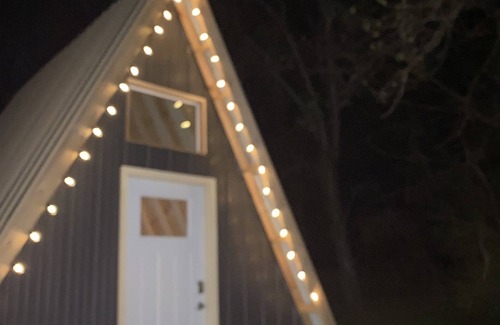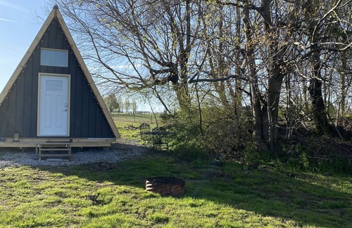 Glamorous camping at its best in this cute and cozy Aframe. Climate control with AC and heat. Mini fridge, microwave, coffee keurig, towels, paper products. Outside a table, fire pit, charcoal grill complete your camping experience. Campground bathrooms are close by. Birds to wake you in the morning and friendly farm animals are always looking for treats.