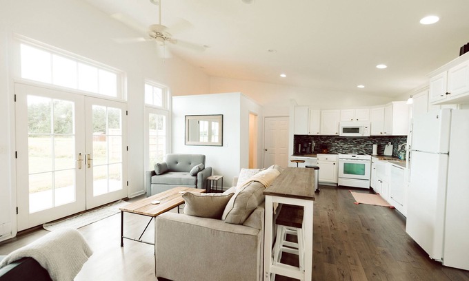 Tranquil home with views for miles. This home is surrounded by serene rural acreage yet two miles to town. Furnished to enhance the calming feeling that envelopes you in this natural space, this home is an oasis; a place to refresh and recharge. Awake naturally to the sunrise from the master, see the moon at night from the living room couch, or engage in bird watching or stargazing from the walk out patio. Need something a little more high energy? The garage is stocked with a grill, outdoor games, and an indoor/outdoor eating space. Enjoy some fun in the spacious yard, or take a stroll on the country acres surrounding the property. A hidden gem - a small space that is large on charm. Sleeping Arrangements: king bed in master, bunk bed in children's room. sofa sleeper, and twin sleeper chair in living room. This house is open concept with vaulted ceilings and 8 ft walls for bedrooms. This house will comfortably sleep four adults with the twin sleeper and bunks more appropriate for children. This house can sleep 6, but more comfortably sleeps 4. Bathroom: walk in shower, washer, dryer in bathroom off master. Living/Dining: open concept - bar stool at kitchen counter, high top seats 3 overlooking living room with amazing views, table seats 6 in garage for extra or outdoor seating. Living room has sleeper sofa, two chairs, and an oversized twin sleeper chair. Appliances: Full size fridge, oven, stove, microwave, dishwasher, deep farmhouse sink, Keurig w/coffee pot, tea pot, French press. Fully stocked kitchen. Grill: brand new grill with tools. Outdoor area: walk out patio with French doors from living space. Seats two. Additional seating for two on East side overlooking acreage. Bistro set on North side of house. Garage has table that seats 6 and is designed for indoor/outdoor use, can be carried outside or used inside. Fire pit with starter wood provided.