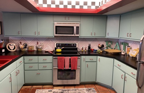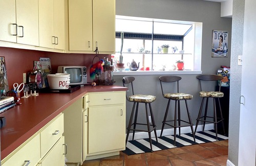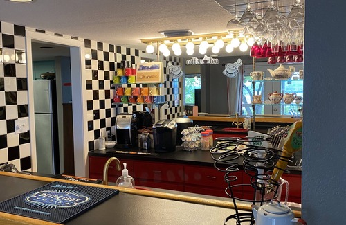 This 3000 sq foot home is fully furnished, with a vintage-style interior and living room with an open floorplan and a retro-style kitchen and bar area, including a stocked coffee and tea bar, and let’s not fail to mention the stocked popcorn bar in our retro sun room.