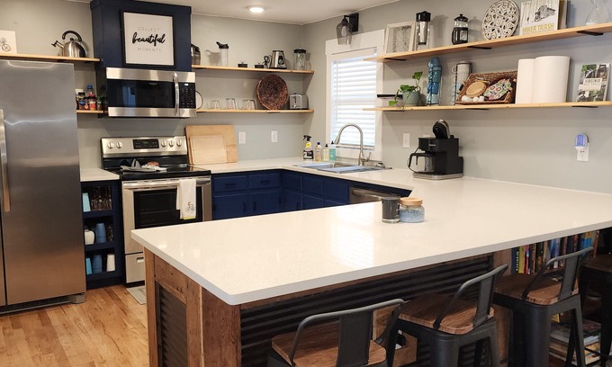 This beautifully renovated home features four spacious bedrooms and three full bathrooms, comfortably sleeping up to twelve guests. The open-concept design ensures everyone can stay connected while enjoying the generous living spaces, including a comfortable family room with a 65” smart TV and a fully equipped kitchen perfect for catering meals. Each master suite is thoughtfully designed with king and queen beds, featuring modern conveniences such as HDTVs and private bathrooms. Enjoy leisurely mornings on the expansive front porch, ideal for sipping coffee or sharing stories before the big event.