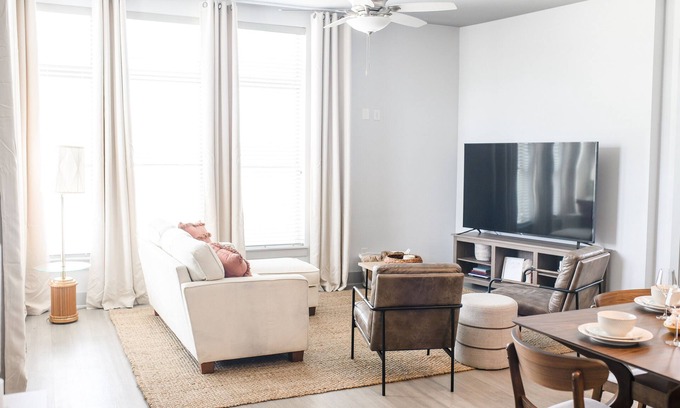 Keep it simple at this peaceful and centrally-located place. We know what travel nurses and longer stay guests want. A spacious abode in a wonderful location with a super comfy bed and sofa. And we definitely deliver. Plus you'll really enjoy the modern amenities, cascading shower and super sized TV for all your binging needs. Plus, do laundry in the comfort of your own place! Welcome home, sit a spell!