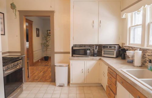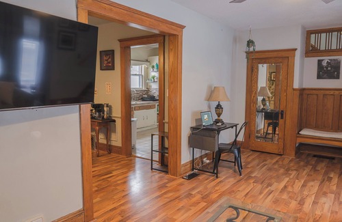 Beautifully updated home blending modern comfort with vintage charm. Features luxury vinyl plank flooring, rich oak trim, and abundant natural light. Cozy living room with comfortable seating, spacious bedroom with modern amenities, and renovated bathroom. Thoughtful details throughout create a welcoming atmosphere.
