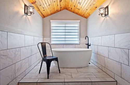 Escape to a spacious getaway in the upper level of the Inn featuring vaulted ceilings, a king-sized bed, large sofa, stand-alone tub in an alcove overlooking the beautiful grounds, satellite TV/DVD, and a private bath with a tiled walk-in shower.