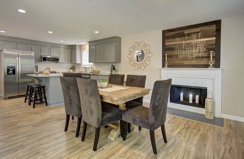 Cook a full meal in the large kitchen with enough room for whole family to cook together. Outside or in, you'll find plenty of seating for everyone. After dinner, go outside to enjoy the manicured back yard and patio.