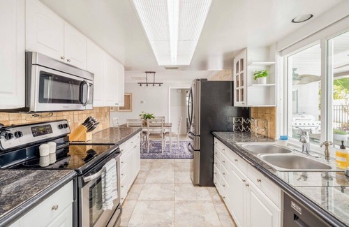 The kitchen is furnished with stainless steel appliances, granite countertops, and a custom coffee bar. Enjoy your meals together around the dining room table, or take it to the back patio for an epic barbecue.