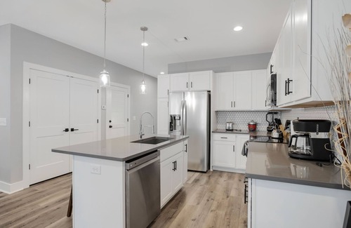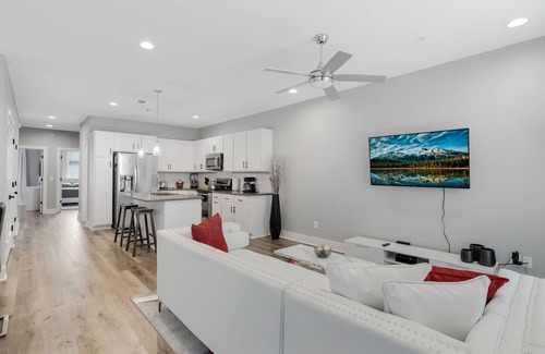 Enjoy this newly built condominium, designed by an award winning architect, in the heart of Greenville. Upon entering the gated community you will find stylish buildings in a quad concept with separate entrances. The loft style apartments are finished with high quality materials and high end amenities. Attention to detail was paid during the design. Enter into this home with a fully stocked kitchen, in unit HE washer and dryers, two full baths, king bed, and everything you need to make it home! This is a 2-bedroom/2-bathroom condominium with a private entrance in a gated condominium community suitable for 1-7 Adults: The entire apartment is private. There is easy access to I-85, local hospital systems, and downtown Greenville! This space is perfect for traveling healthcare workers and healthcare students!