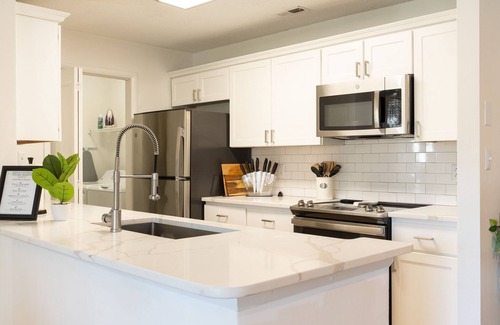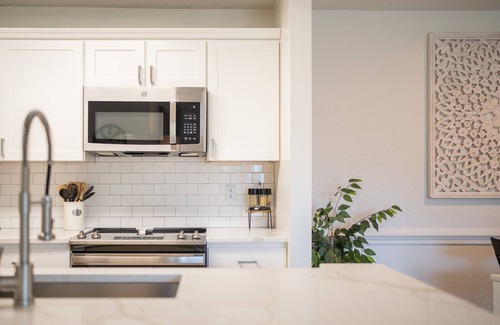 This modern, comfortable space has everything that you need for an unforgettable stay! Large picture windows throughout the house allow for healthy natural lighting. Our open-concept kitchen, dining, and living room has high-ceilings, the perfect area for lounging after a day of exploring! Enjoy all of the comforts of a modern home, such as reliable, high-speed WiFi, laptop friendly workspaces, a fully equipped kitchen, HD television, washer & dryer in-unit, and free parking. Have a morning coffee or evening drink on the patio, relax in the pool, workout in the gym, or take the kids to play in the playground. With pets allowed, this unique designed space is perfect for the whole family and extended stays are welcome!