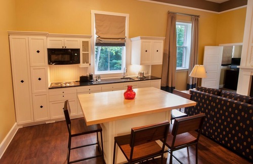 Luxurious suites include a spacious kitchen with a range, an island table with seating, and a dishwasher. These one bedroom suites, offer both sleeping and living space on the same level.