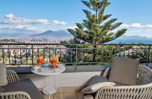 Unique setting for the architectural beauty of the vintage villa, for breathtaking views of the Gulf of Naples and all over the city, for the tranquility of an oasis surrounded by greenery and the proximity to all the means of transport connecting it with the Historic Center and all major sights of the city. Guests have at their disposal a common area with a computer station with internet and printer access; a large double bedroom with bamboo canopy bed, double sofa bed, fitted kitchen, twin bedroom + cot or cot, large bathroom with bathtub and hydromassage shower, equipped panoramic terrace.