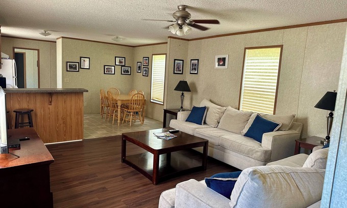 Our rental unit is a 3 Bedroom/2 Full Bathroom modular home with over 1300 square feet of living space and sleeps 8 guests, with each person having his/her own bed. It is nicely appointed and fully furnished. It includes a fully equipped kitchen, satellite television, outside deck, and barbeque pit.