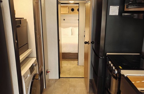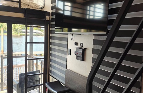 This unique loft style recreational vehicle is the perfect home base for your trip to the Richmond Hill, Savannah area. With a cozy bedroom featuring a Olympic queen bed, a fully equipped bathroom with a large shower and tankless (endless)hot water heater. Additional spaces like a kitchen and living room with a sofa bed and two lofts, one is large with a Olympic queen bed and a electric fireplace, one small loft with a twin bed. The site has a large riverside deck with a grill, table and seating, the modern kitchen has a stove and oven, microwave, dishwasher, washer/dryer combo, oversized refrigerator/freezer. The RV has two overhead ACs in the living area and we added a mini split AC/heat pump in the master bedroom for the utmost in comfort. Guests will find this RV a wonderful retreat and in a great location, just minutes off of I95 and close to shopping and restaurants and less than 30 minutes to Historic Downtown Savannah. For a video walkthrough of the camper search "Kings Ferry Timberwolf" on You Tube. There is parking for one vehicle at the RV, and nearby overflow parking for a second vehicle or boat. Dock use is included with a boat ramp on property. We look forward to welcoming you to our place.