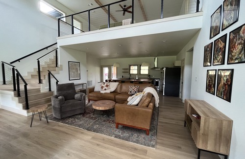 Enjoy this house on the river within a gated community. The location pin for the property is NOT downtown***the house is located off Hwy 62E on Carroll County Road 309 to 329 in the Kings River Landing development. ***This property features 2 primary bedrooms downstairs each with a queen bed and full bath. A huge sleeping loft upstairs with 2 queens, a futon and a full bathroom. There is also an empty office that could accommodate an inflatable mattress(not included ) A maximum of 8 people. The house has high speed 5G internet. The house is fully furnished inside with a welcoming area to relax, a complete kitchen with oven, refrigerator and dishwasher. The utility room has a washer and dryer. Smart tv’s in all rooms. Outside there is an EV charging station in the 2 car carport, and a lockable storage area with a bike rack inside. A Ring Camera is outside the front door. Enjoy local area attractions or just hang out on the river to float or fish in the trophy smallmouth waterway. You can also enjoy the back porch with a fire and a movie. The neighborhood has a common area with a gravel bar that you can also enjoy. Since this is a gated community there is a code for the front gate to enter.