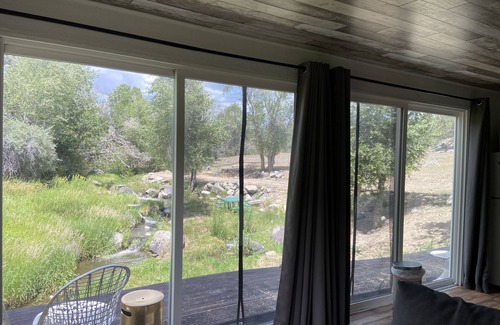 This is a true tiny house located on a multi unit 20 acre property on the banks of the year round Kisercreek. Enjoy the sounds of the year round creek from everywhere inside and outside the tiny house. All the comforts of home full kitchen full bathroom comfortable queen tempur-pedic bed and comfortable sofa bed. The tiny house is elevated over the creek there is NO handrails surrounding the deck. Not safe for children. The deck flooring is made of steel grate so can be uncomfortable for some dogs to walk on. Cell phone service can be spotty at times. Internet is typically good. L 10 miles to top of Grand Mesa 15 miles from Delta, 35 miles to POWDERHORN ski resort 4 miles from downtown main street Cedaredge w markets,cafes, coffee shops, fruit & wine shops etc.