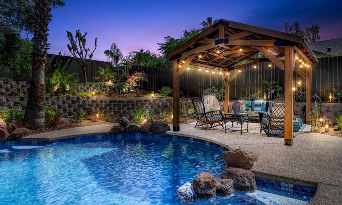 Designer retreat!!! 4bdrm/2bath, one level luxury home boasting a peaceful private retreat with a beautiful solar heated pool, brand new spa, and multiple covered outdoor sitting and dining areas. Large garage equipped with shuffleboard, billiard, fooseball and darts. EV charger. Cook at home in a fully stocked gourmet kitchen or take a 5 min drive to nearby family and high-end restaurants, movie theaters, and shopping. Steps away from a spacious green area park with a large playground. 30 minutes to downtown Sacramento, 1.5 hours to Tahoe, San Francisco or Napa, and too many local attractions to list! Welcome to beautiful wonderland where functionality meets practicality and design! This newly renovated, one level, all fenced home is located on a safe quiet neighborhood street. Whole house is lovingly set up for the needs of all your family members. This house feels very specious and has multiple sitting areas for conversations and dining inside and outside. You will love watching sunsets through the trees on a lazy relaxing afternoon. Play in the pool, spa, or the garage playroom or venture out and rent motorized as well as non-motorized sports at Folsom Lake. Enjoy great hiking and biking trails around the lake. Sacramento Aquatic center also provides non-motorized water sport rentals. Paddleboarding or kayaking anyone? Multiple wineries and craft breweries to visit and explore. Thunder Valley Casino for the fate temping kind. Kids' activities include Sunsplash Water Park, Quarry Park Adventures, Sacramento Zoo and Fairyland, bowling, mini golf, bumper cars to name a few. Guest satisfaction and happiness are our number one priority. We only own and operate two houses (soon to be 3) as short-term rentals and take a lot of pride in it. Both houses are within a mile from each other, and we live nearby also. We are always available to assist our guests with any questions or concerns. Please let us know sooner rather than later if something needs to be addressed so we can make your stay more enjoyable, and the house will be ready for the next guest. But, most importantly, have a wonderful time and build those lifetime memories with your family and friends!