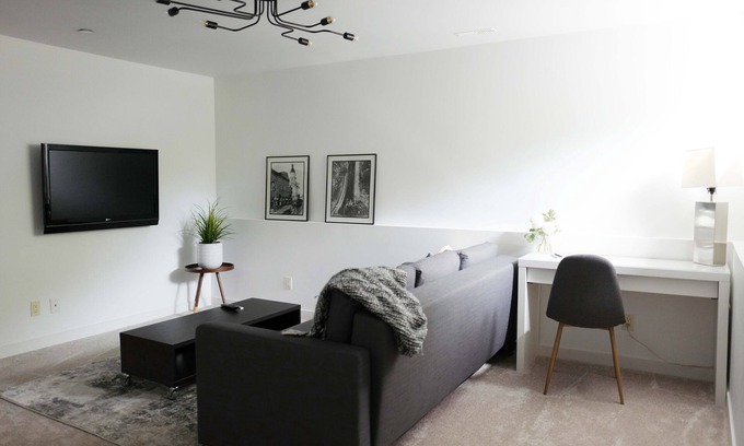 This is a comfortable self-contained spacious one-bedroom lower-level suite (basement), best suited for couples, business, single travelers or a small family. Enjoy a very comfortable king size bed, lots of pillows - living room, kitchen & desk area. Cozy up in the living room on the sofa or turn it into a queen bed for the evening. A large screen tv, a desk area and high-speed internet is available. Full kitchen, with Keurig machine, French press coffee maker available for those that enjoy traveling with their favorite beans, fridge has water, ice dispenser and all the equipment needed for meals. Bathroom has towels, shampoo/conditioner/ body wash are provided along with a hair dryer. In the bedroom you will find a hand steamer and a luggage rack. Umbrella for your use stored in the front wardrobe. A Bosch washer and dryer are available for your small loads of laundry. None of the amenities are shared with the main house or anybody else. Lots of free parking on the street.