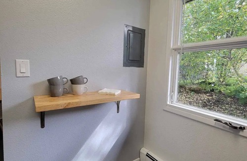 There are 2 bedrooms. One with a queen size bed and the other with 2 twin beds. There is a full kitchen with all the essentials for preparing your own meals. Dining room has seating for 4. The living room includes a wood burning fireplace, seating and a 55 inch smart TV. There is a full bathroom. Washer and dryer are located in the space for your personal use.