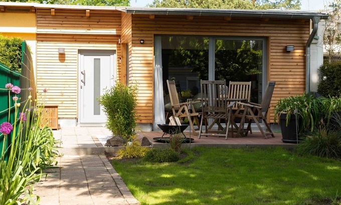 The house has been lovingly renovated over the past 1.5 years. The house is located in the resort on Griminitzsee in Schorfheide, one of the largest contiguous forest areas in Europe and about 60km north of Berlin. The apartment is designed for up to 4 people. Two wonderful terraces a shower room, a fully equipped kitchen with dishwasher, oven, induction hob. The bedroom with a 160cm x 200cm bed and the "best mattress ever tested" and a sofa bed (140cm x 200cm) in the living / dining area with cozy underfloor heating. TV, Apple TV and WiFi are part of the equipment. A travel cot and a high chair are also available. A washing machine, a grill and a fire bowl complete the equipment. Bed linen and towels are provided. Cleaning costs are included.